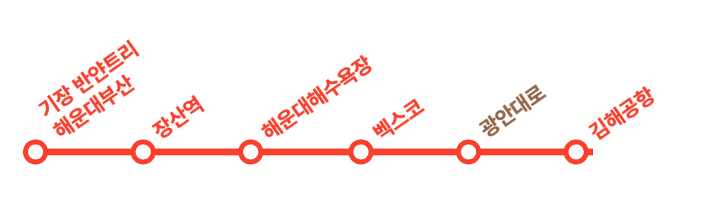 - 기장 반얀트리해운대부산 → 장산역 → 해운대해수욕장 → 벡스코 → 광안대로 → 김해공항