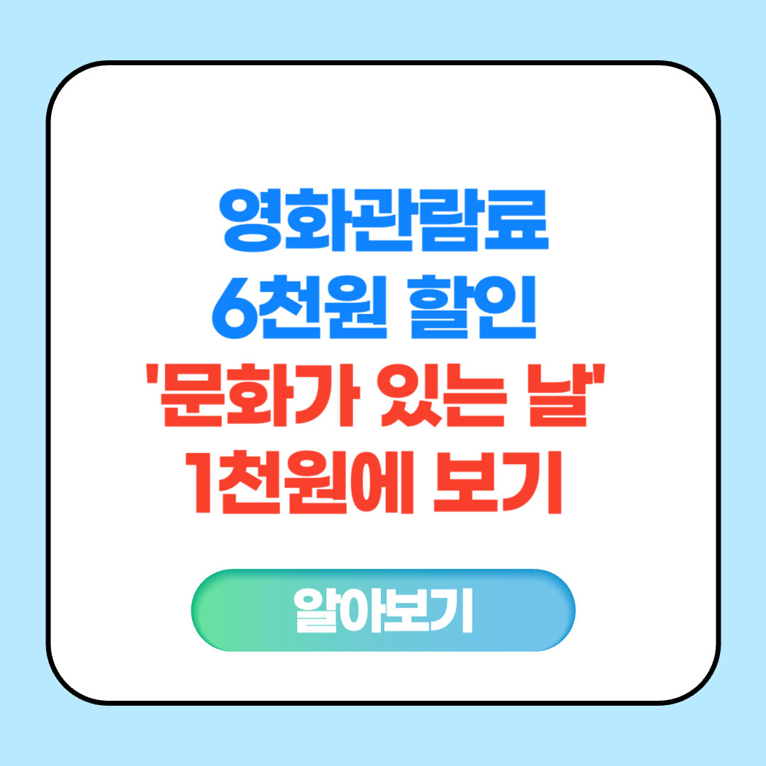 ‘문화가 있는 날’은 매달 마지막 수요일로, 문화체육관광부가 국민 문화생활 활성화를 위해 2014년부터 시행하고 있는 제도입니다. 이 날엔 주요 영화관에서 오후 5시~9시 상영 작품을 할인된 가격에 즐길 수 있어요.