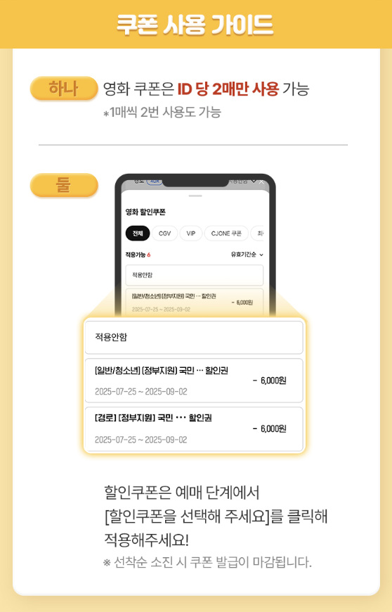 쿠폰은 선착순으로 지급되므로 빠르게 확인하고 놓치지 마세요. 여러분의 여름 문화생활이 더욱 풍성해지길 바랍니다 🎬